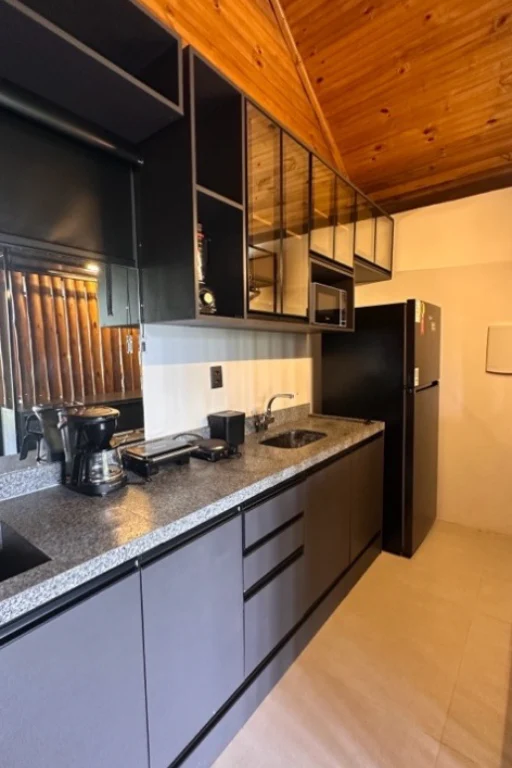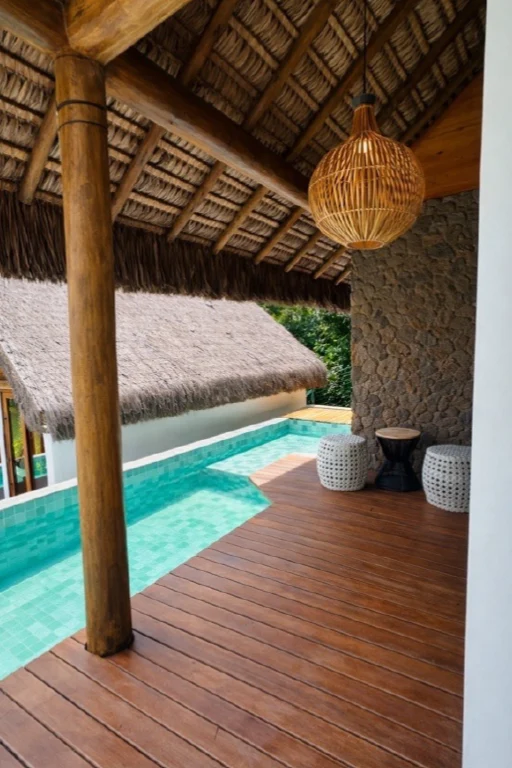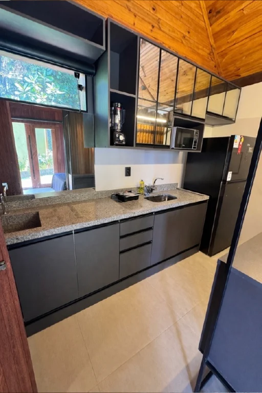 A piscina privativa é o grande destaque do espaço, criando um cenário perfeito para momentos de relaxamento absoluto, seja ao longo do dia ou no fim da tarde, quando o silêncio e a natureza se tornam ainda mais presentes.